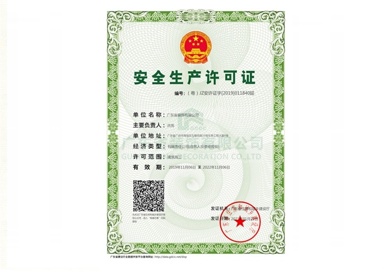 广东省装饰有限公司于2021年1月22日已完成“安全生产许可证”主要负责人变更,并由广东省住房和城乡建设厅下发有效证书。旧文件于成功变更之后即刻作废!